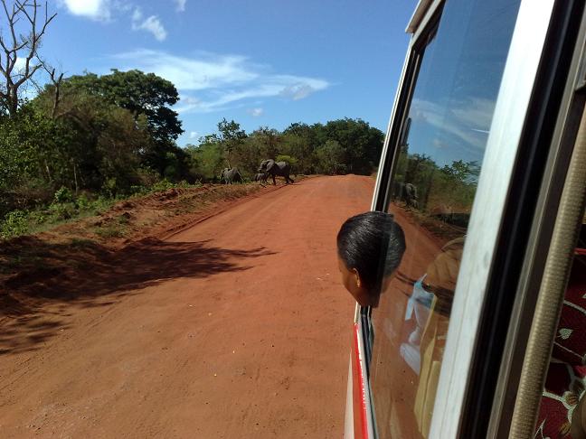 We all got on the bus around 2.30 to drive everyone back to their communities, including the 2-3 kids who lived in other communities. The door fell off the bus last night as we were coming back from the beach, so the bus was really breezy. We drove around through really lush green areas where the national park and elephant sanctuary is first (and saw a herd of 4 elephants!) and then through a very arid place, and then back to a different hotel right on the beach where Wajuhi, Ali K and Ali M, and Rama and I will put the finishing touches on the videos, do the transcriptions and translations, and wrap it all up before we go home on Wednesday. There was Arabic music playing in the bus and the guys got going singing all these songs in Swahili on top of it. Maybe some of it will be nice for background music on the videos?