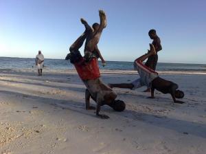 We got to our hotel around 6.30. It’s really nice – gorgeous floors and wood staircases, white washed, beautiful gardens, right on the beach. Since it’s low season Plan Kenya gets a good discount price. But I guess it’s geared to the older tourist. They were having bingo at 9.15 last night! I checked out the beach this morning and it’s not that great of a beach because it’s not flat and there is a lot of seaweed washing up, but nice for a solitary walk in the early morning.