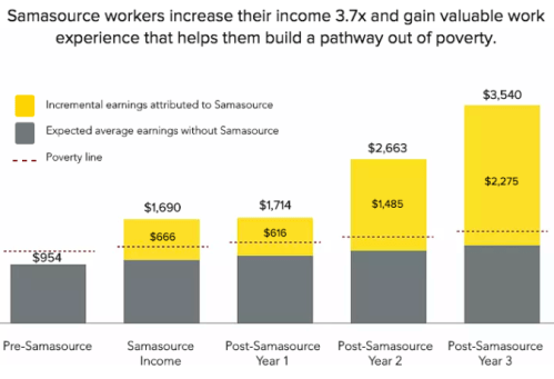 The organization puts potential micro workers through an assessment process (former employment history, level of education, context) to predict and select which of the potential workers will offer the highest impact. Most of Samasources’ workers were underemployed or unemployed before coming to Samasource. At Samaschool they learn digital literacy, soft skills, and the technical skills that will enable them to succeed on the job and build their resumes. Research indicates that after 4 years with Samasource, these workers show a 4-fold increase in income.