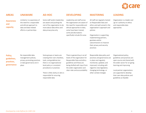 The organization is at the initial phase of creating its Responsible Data Policy. The process includes the development of the values and principles, two country learning visits to understand the practices of country programs and their concerns about data, development of the policy, and a set of guidelines to support staff in following the policy.